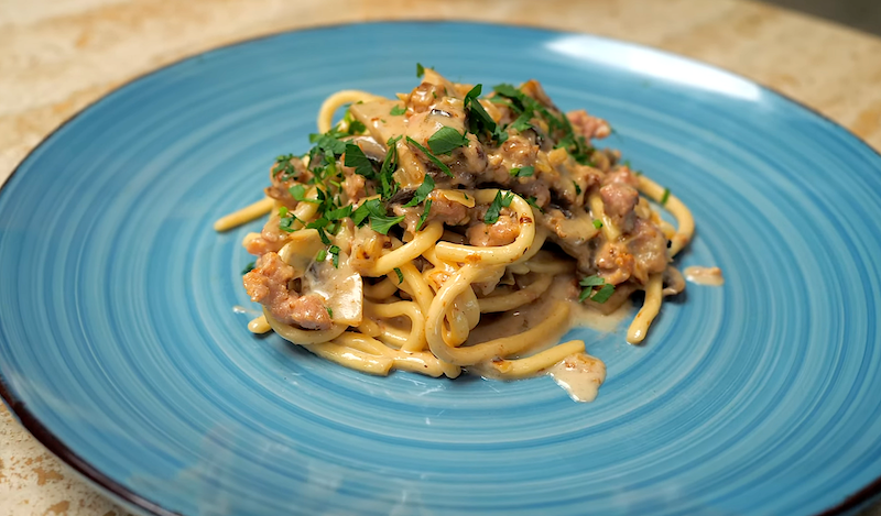 Stringozzi Pasta with Sausage & Mushrooms